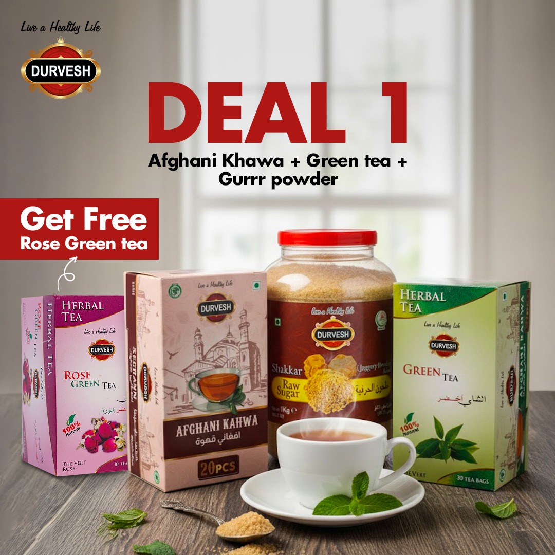 Buy ifghani kahwa ,green tea and gurr powder and get absolutely free rose green tea .